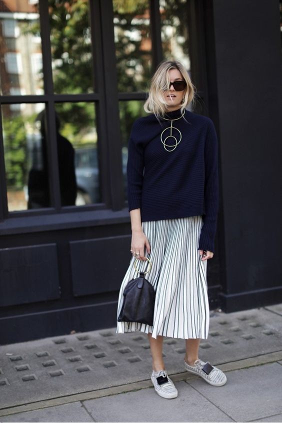 3. Μια πλισέ μίντι φούστα- Για απογευματινές και βραδινές εμφανίσεις με Mules αλλά και αθλητικά, με πουλοβεράκια, t-shirts και μπουφάν bomber ή το δερμάτινό σου.
