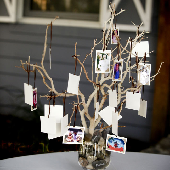 Να μια ακόμη όμορφη και πολύ εύκολη ιδέα που αυτό που χρειάζεται να έχετε είναι... αναμνήσεις τυπωμένες σε χαρτί. Αυτό που θέλουμε να πούμε είναι να έχετε φωτογραφίες από διάφορες στιγμές της ζωής σας, με τους αγαπημένους σας ανθρώπους. Πώς θα το κάνετε; Μέσα σ΄ένα γυάλινο βάζο ή γυάλα (γενικά θα σας προτείνουμε αρκετές ιδέες στις οποίες χρειάζεται ένα γυάλινα βάζο, αλλά μπορείτε να του αλλάζετε χρήσεις) βάλτε μερικά βότσαλα που θα μαζέψετε από την παραλία. Καλό θα ήταν να τα σαπουνίσετε για να φύγει το αλάτι κι αν έχετε κέφι να περάσετε κι ένα βερνίκι, θα είναι... super! Μέσα θα τοποθετήσετε, σα να φυτεύετε σκεφτείτε, δυο τρία κλαριά. Διαλέξτε όσες φωτογραφίες σας αρέσουν, ανοίξτε μια μικρή τρύπα στην μέση της πάνω πλευράς κι από εκεί περάστε χοντρές πολύχρωμες κλωστές ή σκοινάκια ώστε να κρέμονται οι φωτογραφίες σας. Το οικογενειακό σας δέντρο είναι έτοιμο για να στολίσει μια γωνιά του σπιτιού σας!